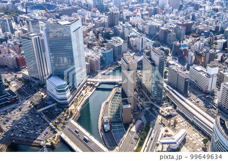 日本の横浜都市景観 横浜・桜木町駅や横浜桜木町ワシントンホテル、富士ソフトなどを望む