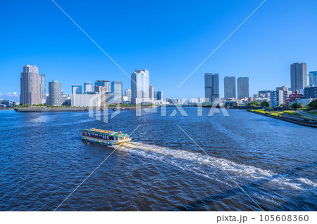 日本の東京都市景観 相生橋から豊洲や屋形船などを望む
