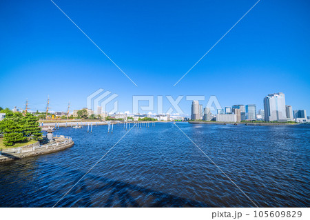 日本の東京都市景観 相生橋から豊洲水門や豊洲、屋形船(新浪)などを望む