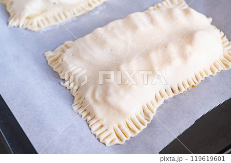 並べた薄切りりんごにパイシートをかぶせフチを閉じる
