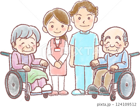 介護職員と車椅子に乗った高齢男女_ 介護のイラスト