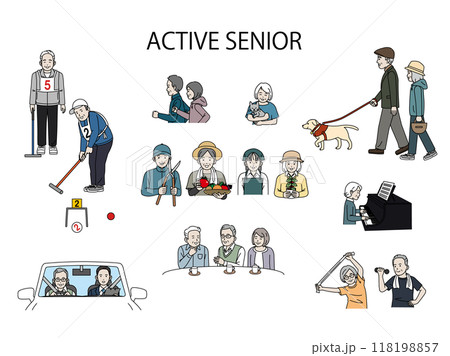 アクティブシニア、老後や趣味を楽しむ高齢者のイラスト