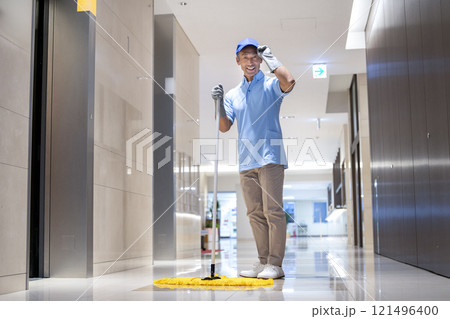 ビル清掃イメージ モップで床を拭く60代の男性クリーニングスタッフ