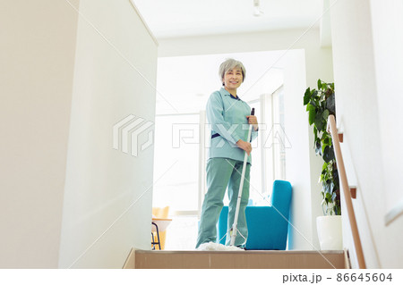 ビル清掃をするシニアのクリーニングスタッフ カメラ目線で笑顔のポートレート