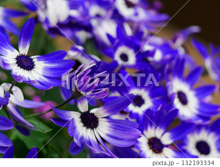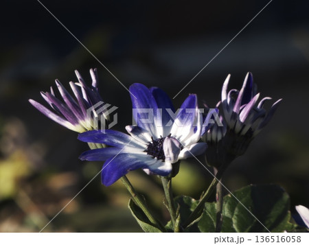 光が差し込む青と白のサイネリア(シネラリア)のクローズアップ
