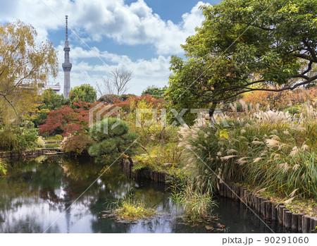 [東京・東向島] ススキと紅葉に囲まれる秋の向島百花園の池と東京スカイツリーの風景。