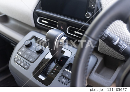 Automatic gear stick of a modern car. Car interior details. Transmission shift.
