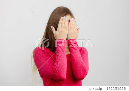 Shy teenage girl peeking through fingers, covering face with both hands over orange studio background with copy space