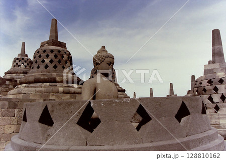 Borobudur / ボロブドゥール寺院遺跡群,境内の内側 仏塔と仏像の座像 - 横アングル撮り