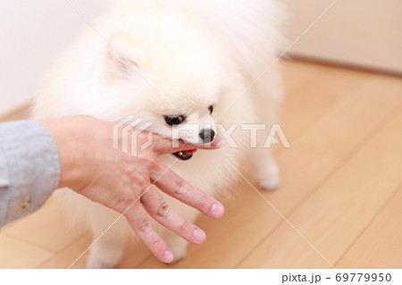 愛犬ポメラニアンに手を噛まれる男性