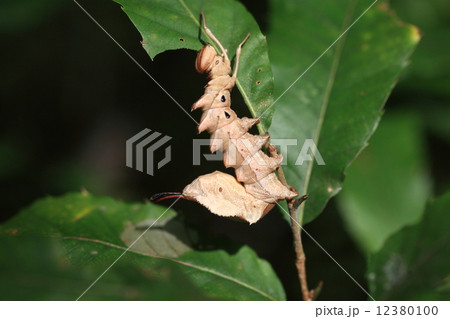 生き物 昆虫 シャチホコガ、幼虫がクヌギの葉を食べています。イモムシにしては珍しく長い足を持っています