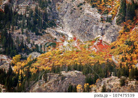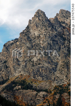 アメリカ合衆国 秋のグランドティトン国立公園 ジェニーレイクシャトルボートから見上げるティトン山の黄