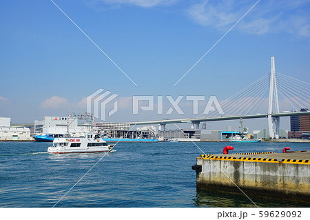 日本の横浜都市景観 横浜ハンマーヘッドや新港ふ頭客船ターミナルなどを望む。左はシエルブルー=23日