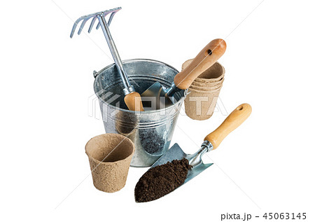 Planting Flowers. Bucket, Shovel, Seeds, Dlay Isolated on White