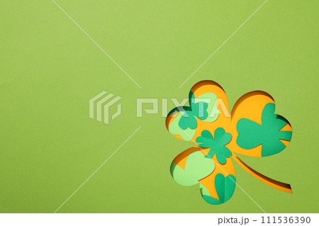 Paper clover leaves on green background, space for text