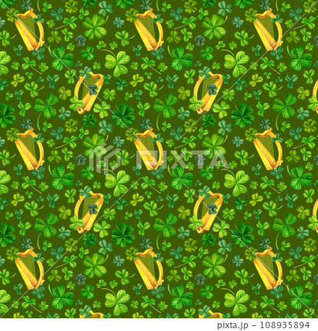 Watercolor seamless pattern with Irish harp and shamrocks. Illustrations with metal and natural texture in vintage style on green background