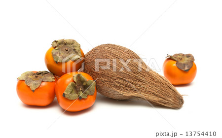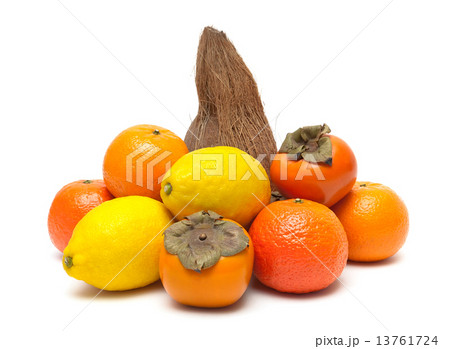 tangerine, coconut, persimmon and lemon isolated on a white back