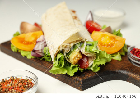 Grilled chicken wrap with fresh vegetables. Greek gyro wrap.