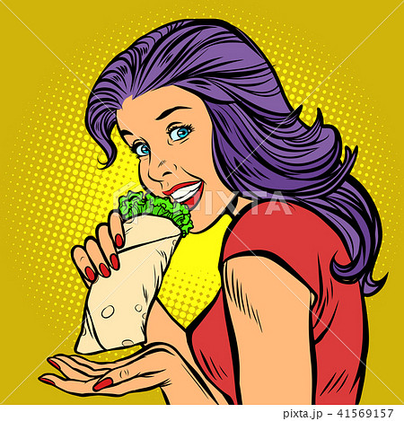 Shawarma kebab Doner. Hungry woman eating fast food