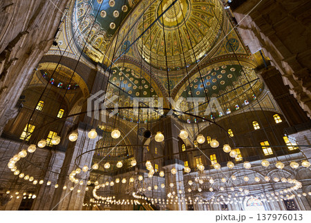 ムハンマド・アリ・モスク内部の精緻な装飾ドームと光の輪(カイロ)