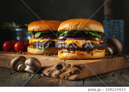 Two delicious homemade burgers of beef, cheese and mushrooms on an wooden table. Fat unhealthy food