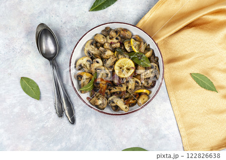 Close-up of tasty cooked fried champignon mushrooms at plate