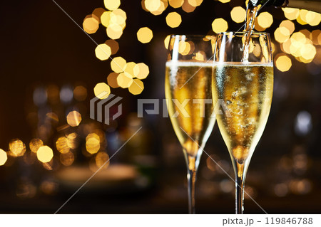 シャンパングラスで乾杯のシーン、パーティーとクリスマスイメージ