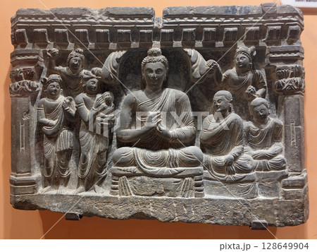 お釈迦様の生涯を表した詳しい仏伝彫刻のうち祇園精舎での奇跡を面チーズにしたガンダーラ彫刻