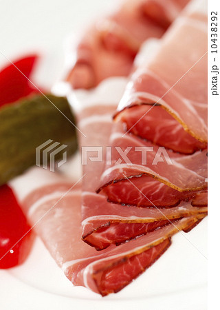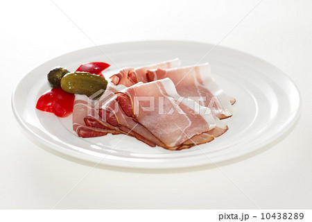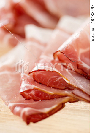 Sliced schwarzwald ham. Dried prosciutto ham isolated on white background.