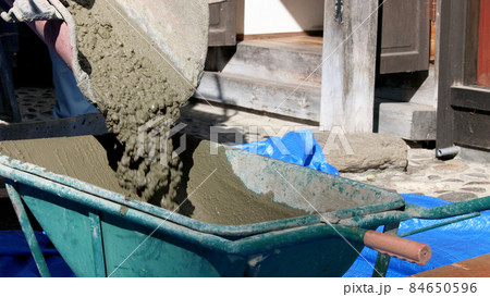 ミキサー車から流れ出る生コンクリート