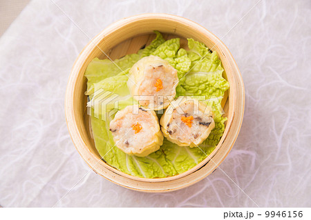 注)湯気は合成です。シューマイ、焼売、中華料理、蒸籠蒸し。