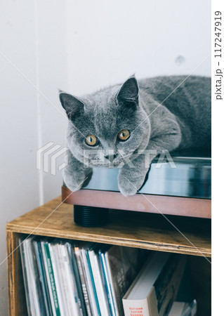 Small blue-black kitten head with paw up on blank white paper, cat Scottish fold.