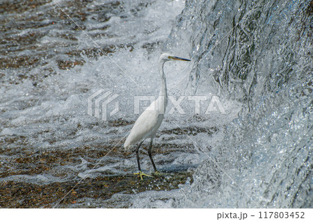 堰の下で小魚を狙うシラサギ(コサギ) 京都市鴨川