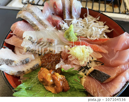 新鮮な海の幸、海鮮丼接写、伊東にて
