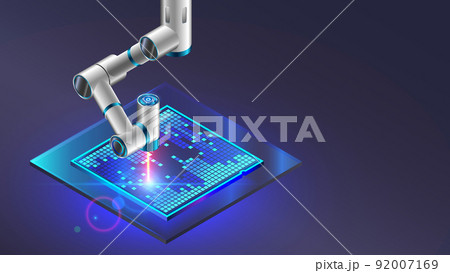 Technology electronic manufacturing of crystal semiconductor chip. Robotic arm productions silicon processor on crystal semiconductor. Electronics industry equipment. Nanotechnology cpu factory.