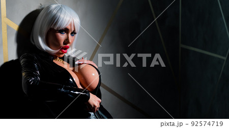 Sexy woman in a blonde wig and latex catsuit. Role-playing games