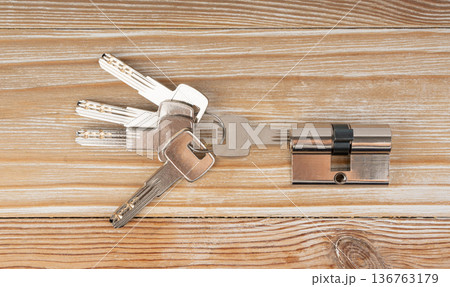 Keys and lock cylinder for door lock isolated. Pin tumbler components ready to replace or repair