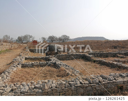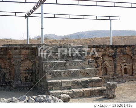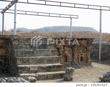 パキスタンのタキシラにある紀元前後の都市遺跡シルカップ遺跡に残る双頭の鷲の塑像彫刻が残る仏塔跡