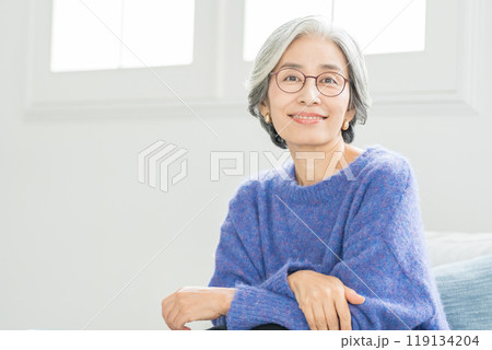 家のリビングでソファーに座る50代ミドル女性のポートレート