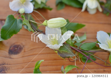 乳白色の冬咲きクレマチスの花とフェルトのひよこ