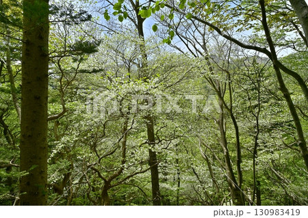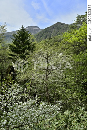 那須連峰の森に花咲くシロヤシオの木々に茶臼岳