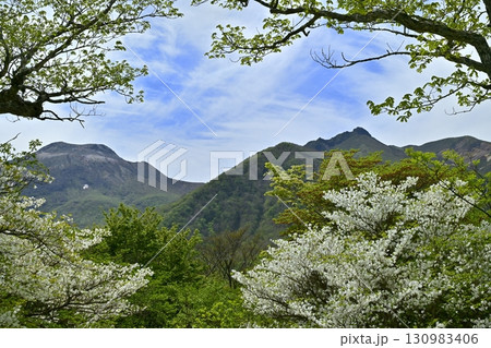 那須連峰の森に花咲くシロヤシオの木々に茶臼岳と朝日岳