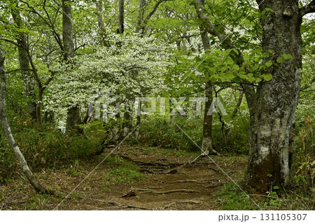 那須連峰の中ノ大倉尾根への登山道とシロヤシオツツジ咲く森