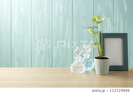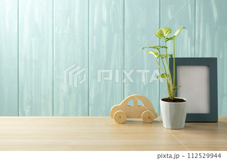 青い壁とシンゴニウムと青い額と木のおもちゃ