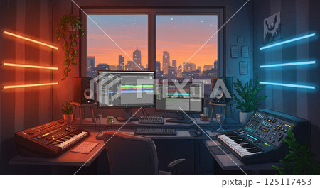 夕焼けの都市を望むローファイ音楽スタジオのデジタルイラスト