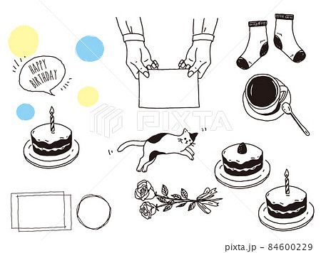 白黒、モノトーン、線画のイラスト(手書き、コーヒー、手、ファッション、猫、ケーキ)