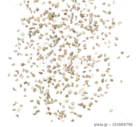 Seashell fall splashing in air. sea shell explosion flying, abstract cloud fly. Many Small Seashell scatter in many group. White background isolated high speed shutter freeze motion