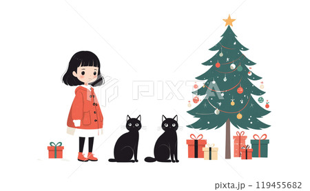 クリスマス、女の子と黒猫│プレゼント│クリスマスツリー│イラスト
