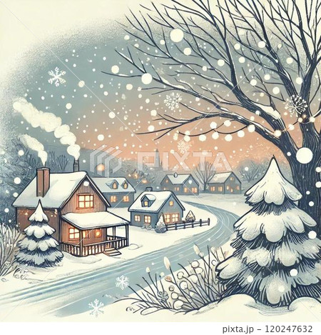 雪山の中で遊ぶこどもたち、家、木々、雪だるま