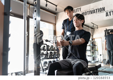 ジム・パーソナルジムでフォームチェックを受ける若いアジア人男性(マンツーマン・指導・レッスン)